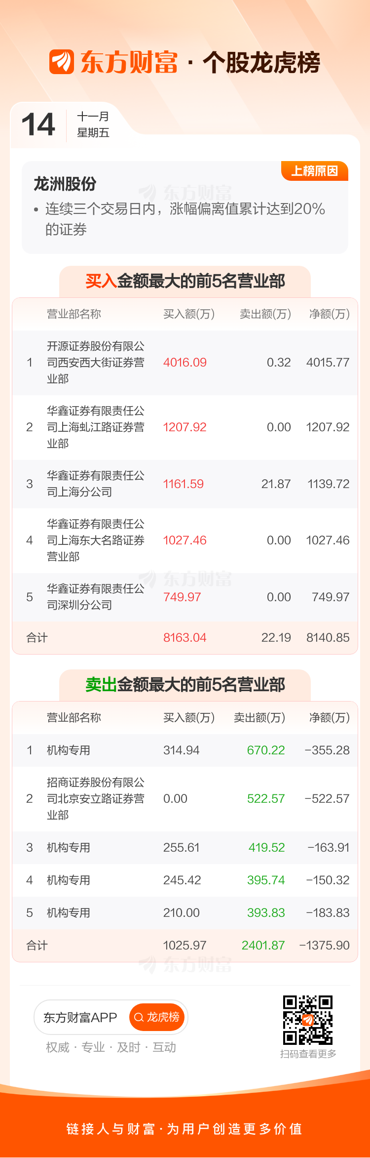 交易所2025年11月14日公布的交易公开信息显示,龙洲股份因成为连续三个交易日内,涨幅偏离值累计达到20%的证券上榜。龙洲股份当日收报6.48元,涨跌幅10.02%,换手率2.07%,成交额7552.36万。异常期间11月13日至11月14日,期间涨幅21.12%,累计偏离值20.97%,区间成交额3.32亿。