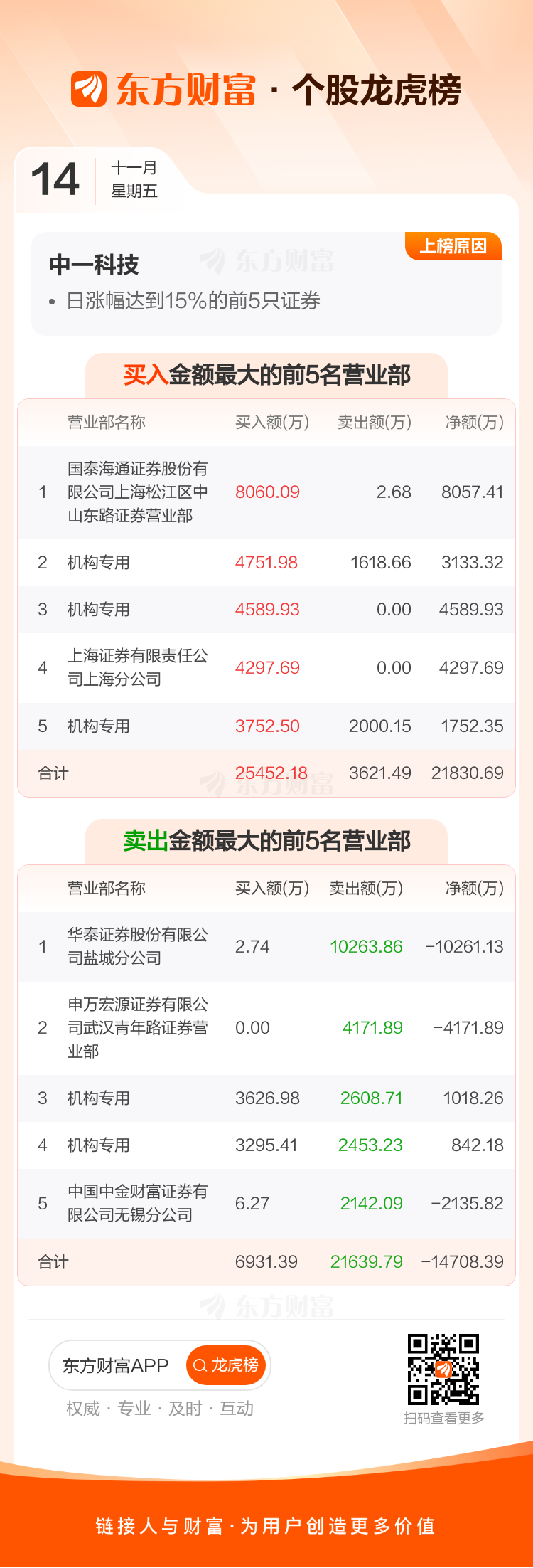 交易所2025年11月14日公布的交易公开信息显示,中一科技因成为日涨幅达到15%的前5只证券上榜。中一科技当日收报52.28元,涨跌幅19.99%,偏离值20.00%,换手率12.89%,成交额13.69亿。