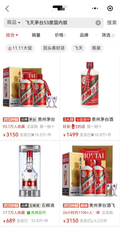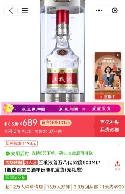这一冲击在名酒品牌中体现得尤为突出。在部分电商平台的“百亿补贴”频道,53度飞天茅台价格已低至1620元/瓶;52度第八代五粮液低至689元/瓶,部分商品已销售数十万件。