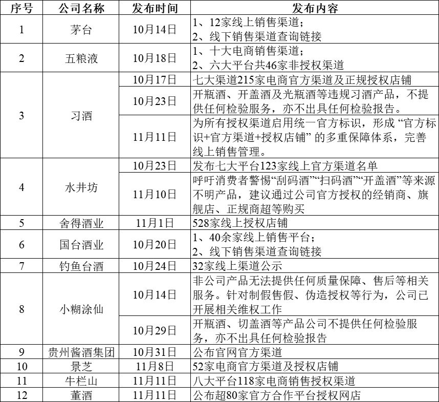 据记者不完全统计,10月中旬以来,包括茅台、五粮液、习酒在内的至少12家白酒企业密集发布渠道声明。