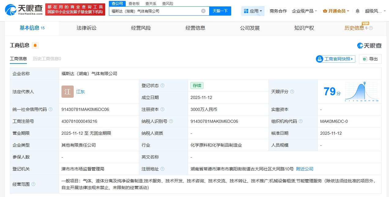 福斯达等在湖南成立气体公司