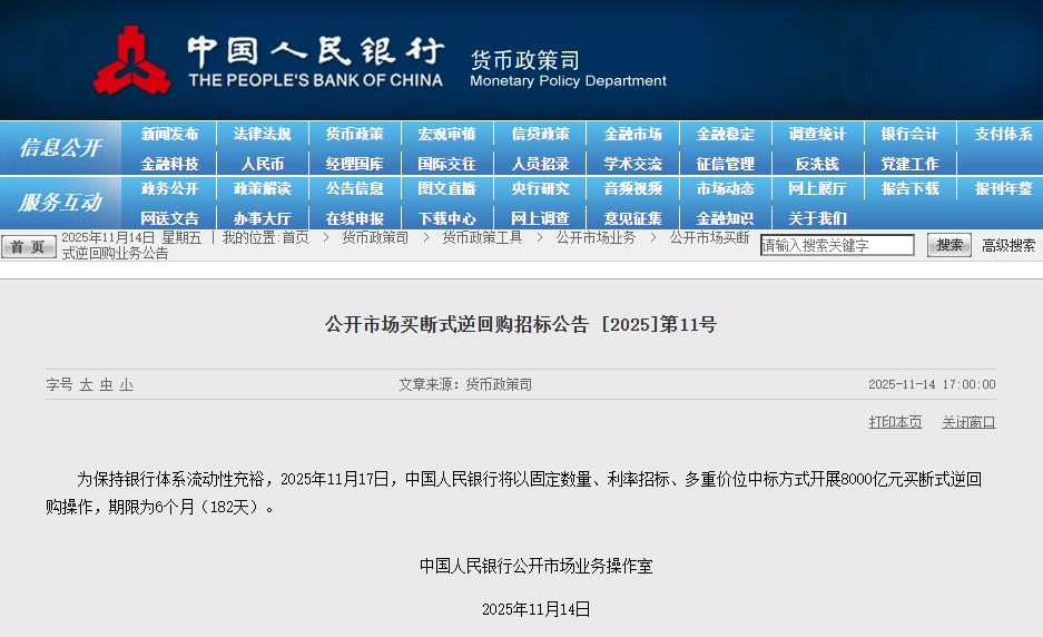 11月14日,中国人民银行发布公开市场买断式逆回购招标公告称,为保持银行体系流动性充裕,2025年11月17日,将以固定数量、利率招标、多重价位中标方式开展8000亿元买断式逆回购操作,期限为6个月(182天)。