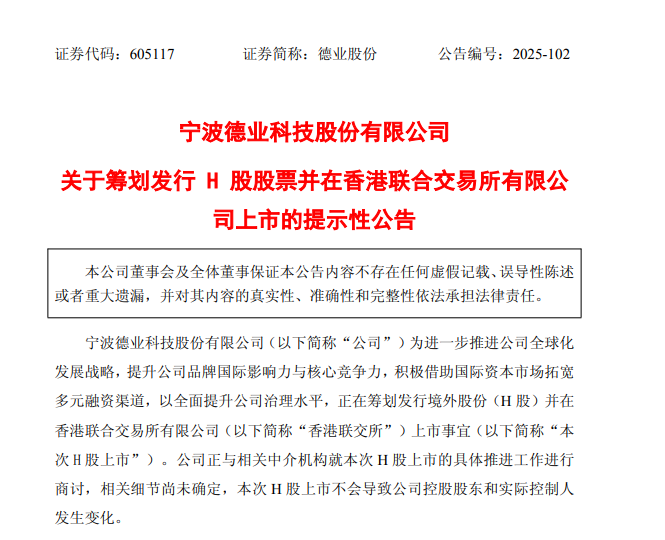德业股份11月13日晚发布公告称,为进一步推进公司全球化发展战略,提升公司品牌国际影响力与核心竞争力,积极借助国际资本市场拓宽多元融资渠道,以全面提升公司治理水平,正在筹划发行境外股份(H股)并在香港联交所上市事宜。