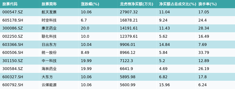 南财智讯11月14日电,南财金融终端数据显示,因当日异动登上龙虎榜的个股中,资金净买入最多的前三位分别是航天发展(000547.SZ)、时空科技(605178.SH)与康芝药业(300086.SZ)。其中排名第一的航天发展净买额达2.79亿元,占总成交金额的11.04%。航天发展当日收盘上涨10.06%,换手率为17.05%,净买入额前10个股详情见下图: