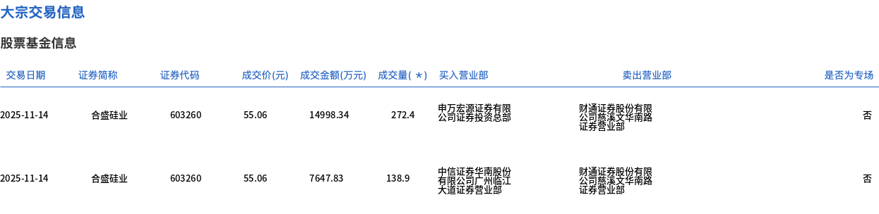 11月14日,合盛硅业大宗交易成交411.3万股,成交额2.26亿元,占当日总成交额的10.17%,成交价55.06元,较市场收盘价59.61元折价7.63%。