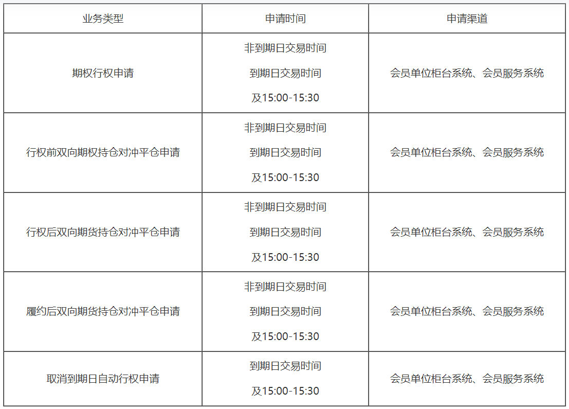 在每个交易日的交易时间以及到期日的15:00-15:30,客户可以提交“行权”、“行权前双向期权持仓对冲平仓”、“行权后双向期货持仓对冲平仓”和“履约后双向期货持仓对冲平仓”申请。