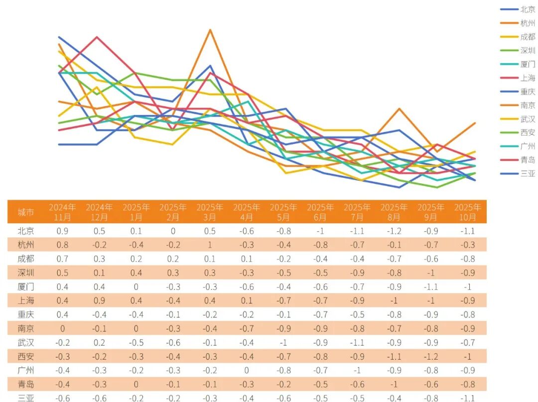 值得注意的是,10月份房价环比上涨的城市数量继续为为0,进一步说明各类城市二手房的价格都在深度调整过程中。