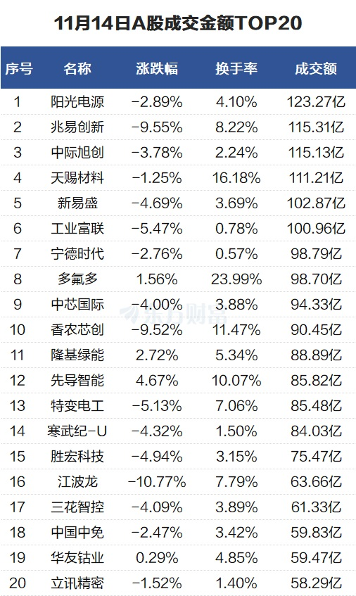 活跃个股:阳光电源成交123亿元 古麒绒材换手率58%