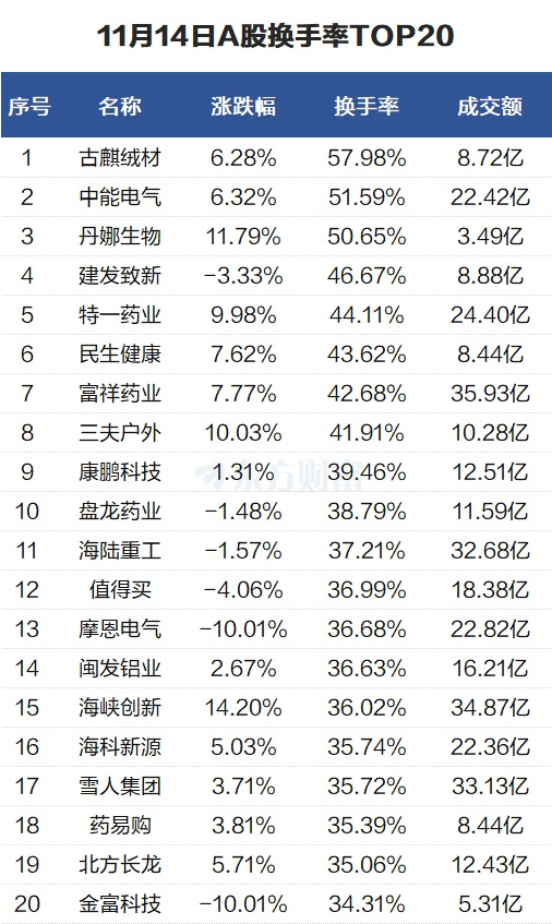 当天换手率最高的个股为古麒绒材,全天换手率57.98%。中能电气紧随其后,全天换手率51.59%。