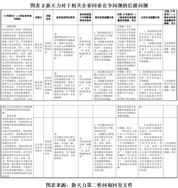 对此,北交所在第二轮问询中指出,新天力声称红达塑业定位境外市场,但是公开信息显示上海的部分商超中存在同时销售新天力和红达塑业产品的情形,要求其结合红达塑业、惠家网络、润洁塑业的产品类别、客户类别、销售区域以及与新天力的对比,说明前述主体是否与新天力构成同业竞争,并根据相关规定说明相关信息披露是否准确、充分。