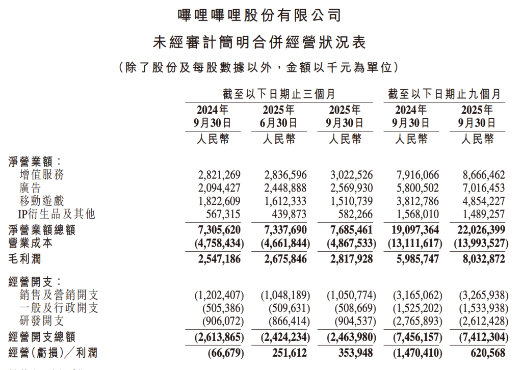 11月13日,哔哩哔哩(Nasdaq:BILI,09626.HK,以下简称“B站”)公布截至9月30日第三季度未经审计的财务报告。数据显示,2025年第三季度B站总营收为76.9亿元,同比增长5%;净利润4.694亿元,去年同期则录得净亏损7980万元;经调整净利润为7.863亿元,同比增长233%,经调整净利润率为10.2%,高于去年同期3.2%。
