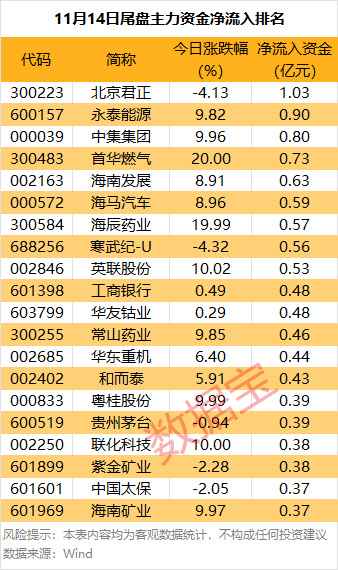 此外,永泰能源、中集集团和首华燃气等尾盘主力资金净流入居前。