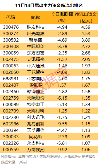 净流出方面,21股尾盘主力资金净流出超1亿元,6股净流出超2亿元。其中,胜宏科技尾盘主力资金净流出居首,达4.59亿元。