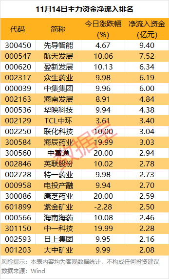 先导智能主力资金净流入9.4亿元,居首。消息面上,11月13日,先导智能在投资者互动平台上表示,公司储能集装箱设备已获得国内外储能头部客户重复批量订单,该业务具备高毛利优势。