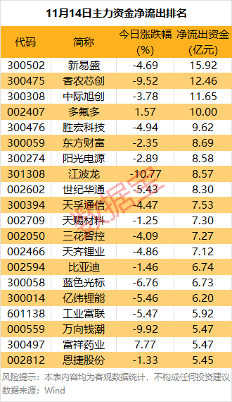 算力、PCB、存储芯片龙头个股遭资金大幅卖出,其中新易盛主力资金净流出金额居首,达15.92亿元。此外,香农芯创、中际旭创、胜宏科技、江波龙、天孚通信等科技股净流出均超7亿元。