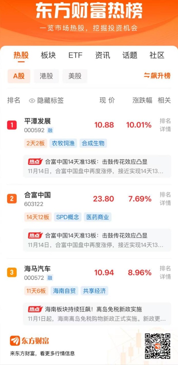 11月14日,两市震荡调整,创业板指领跌。东方财富热股榜前三的股票中,平潭发展位列第1,合富中国位列第2,海马汽车位列第3。