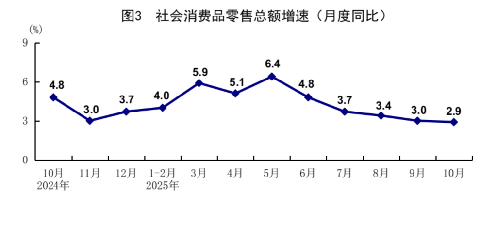 针对10月商品零售增速放缓,东方金诚首席宏观分析师王青认为,主要原因是补贴政策效应减弱叠加上年同期基数抬升,导致政策范围内的部分商品零售增速大幅回落。