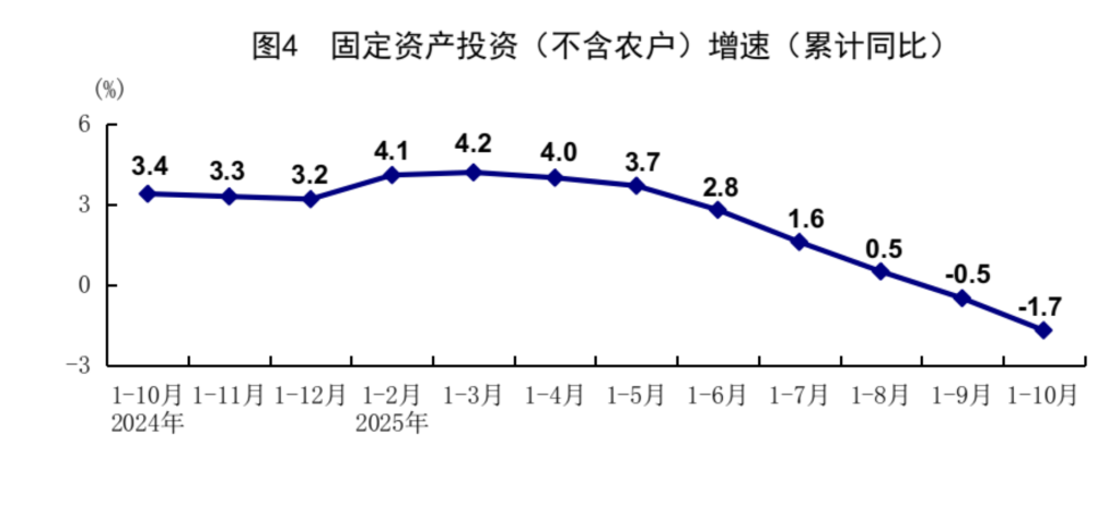 1-10月,全国固定资产投资(不含农户)同比下降1.7%,降幅较前值扩大,扣除房地产开发投资,前10月全国固定资产投资增长1.7%。