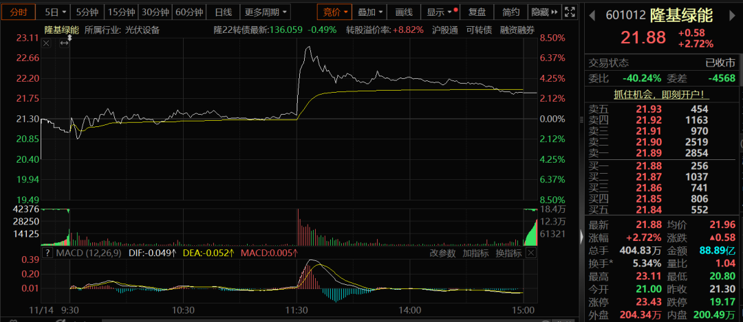 11月14日,隆基绿能股价午后直线拉升,一度涨超8%,截至收盘收涨2.72%。