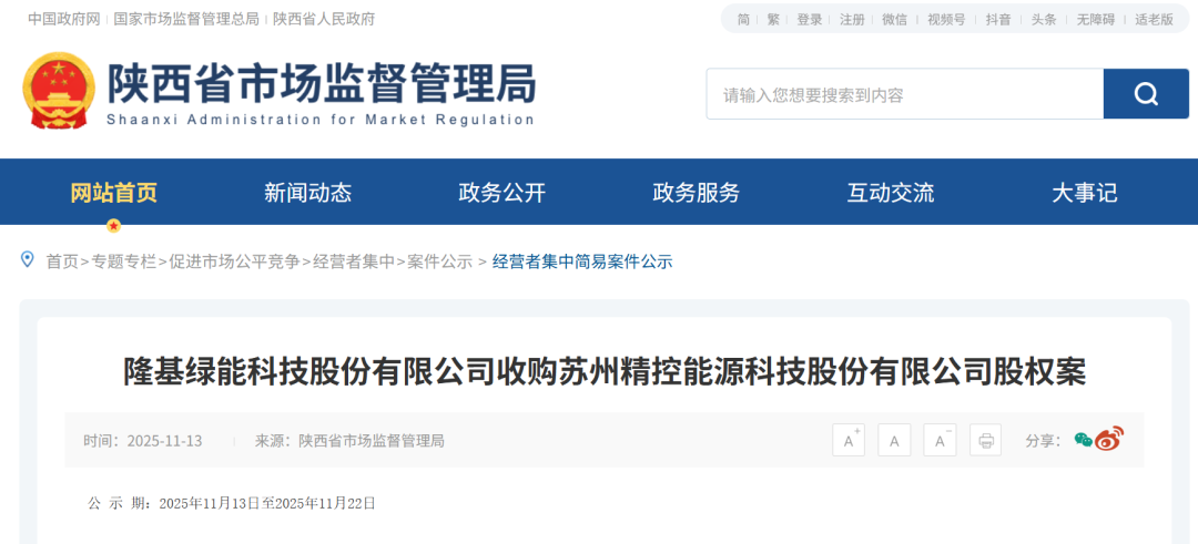 11月13日,陕西省市场监督管理局发布的《经营者集中简易案件公示表》显示,隆基绿能与苏州精控能源科技股份有限公司(简称“精控能源”)等签署协议。
