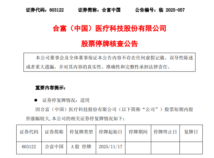 11月14日晚间,合富中国(603122)披露公司股票停牌核查公告称,公司股票将于11月17日(星期一)开市起停牌,预计停牌时间不超过3个交易日,公司股票将自披露核查公告后复牌。