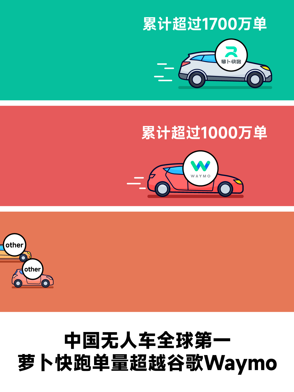 截至目前,百度旗下萝卜快跑每周全无人订单数超25万,全球累计出行服务次数突破1700万次,超越谷歌Waymo,成为全球最大的无人驾驶出行服务平台。