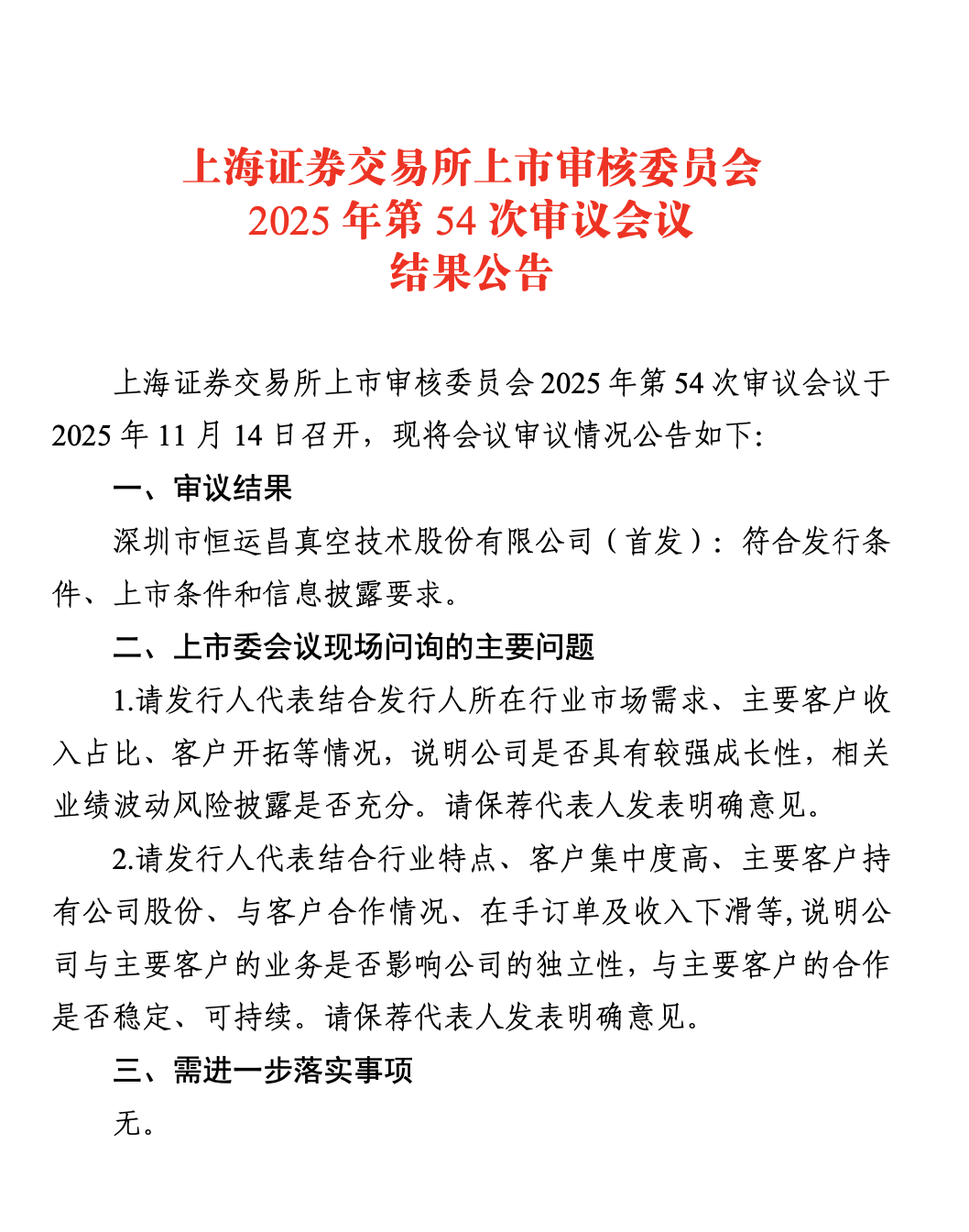今日,上交所上市委审核委员会2025年第54次审议会议通过了深圳市恒运昌真空技术股份有限公司(下称“恒运昌”)的科创板IPO申请,辅导机构为中信证券。该公司IPO申请于2025年6月13日获受理,经历两轮审核问询后,最终得以过会。