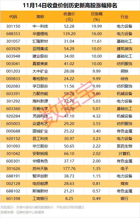 从股价表现来看,收盘价创历史新高股中,今日股价平均上涨6.19%,涨停的有中一科技、亚翔集成、建业股份等,涨幅居前的有华盛锂电、汇隆新材、力聚热能等。