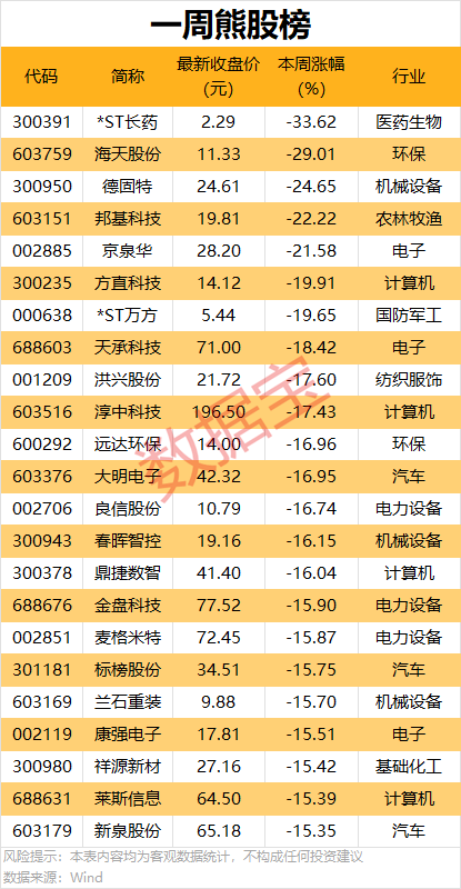本周累计下跌的个股中,101股跌幅在10%以上,*ST长药、海天股份和德固特等5股累计跌幅均超20%。