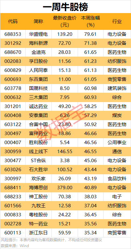 据数据宝统计,本周超3000股上涨,18股涨幅超40%,涨幅最大的是华盛锂电,累计上涨79.61%;海科新源、金迪克和孚日股份等累计涨幅均在60%以上。