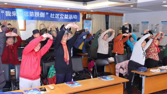 “我来教您防跌倒”课堂上老人们做防跌倒健康操