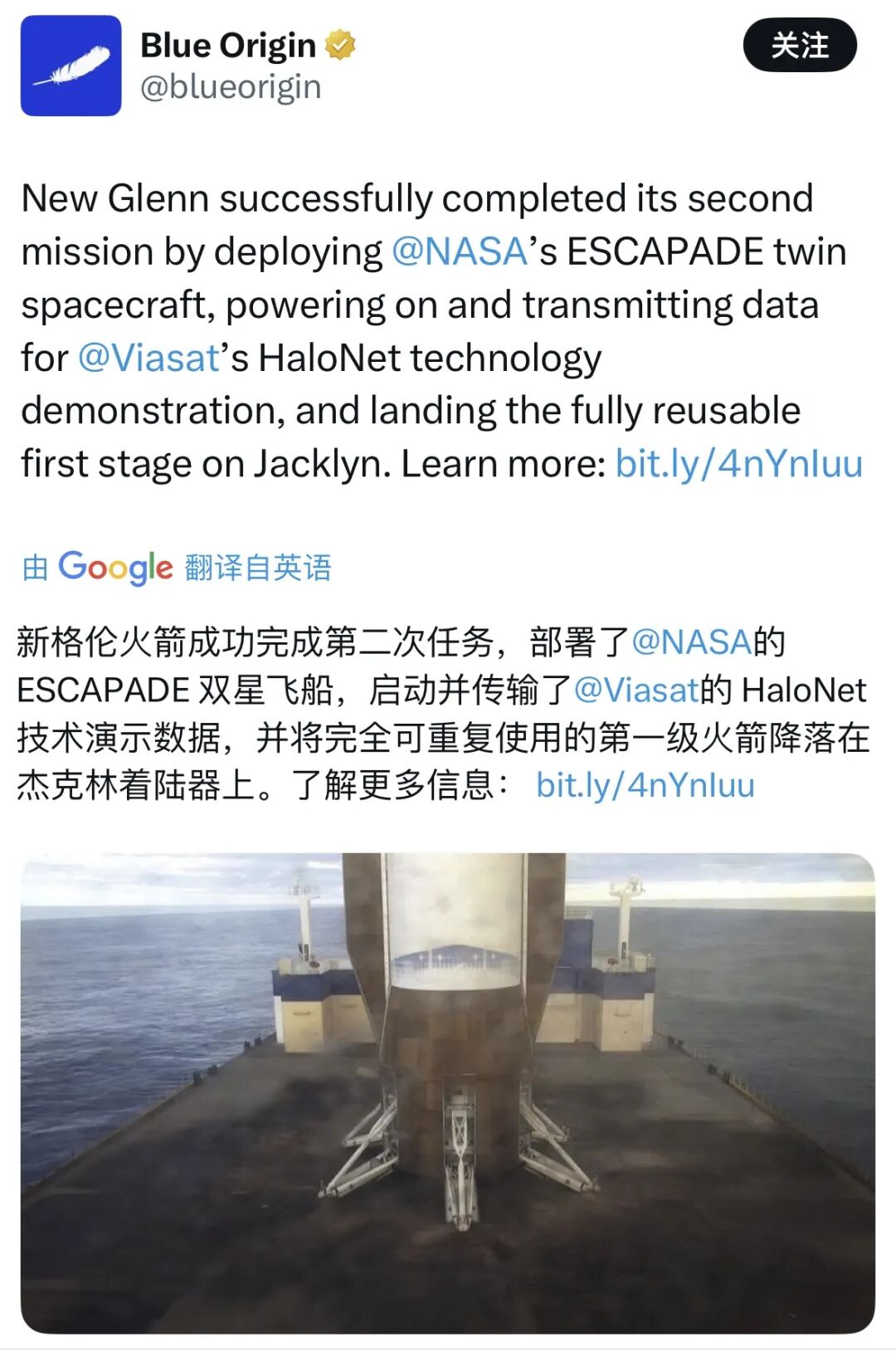 北京时间11月14日凌晨,美国商业航天公司蓝色起源旗下“新格伦”(New Glenn)运载火箭成功完成第二次飞行任务,将美国宇航局(NASA)的ESCAPADE双航天器部署到预定轨道上,其可重复使用的第一级(助推器)降落在大西洋回收平台上。