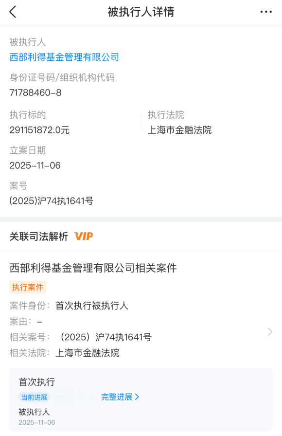 天眼查信息显示,11月6日,上海金融法院对西部利得基金立案执行,案号为(2025)沪74执1641号,执行金额约2.91亿元。