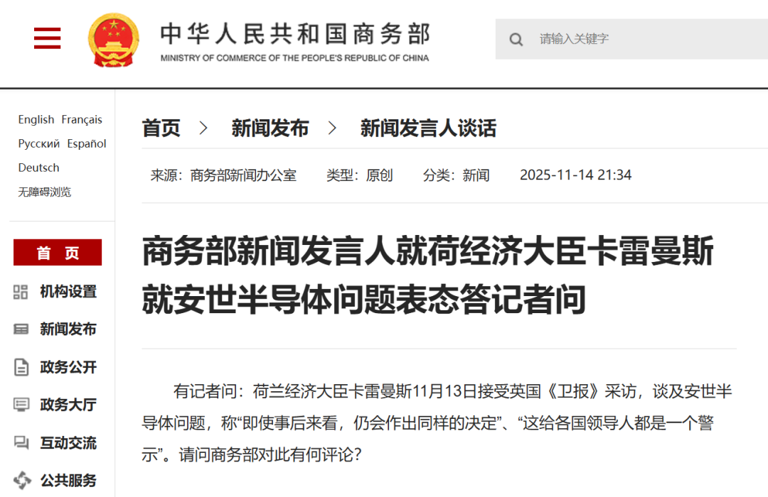 11月14日晚间,商务部官网显示,商务部新闻发言人就荷经济大臣卡雷曼斯就安世半导体问题表态答记者问。