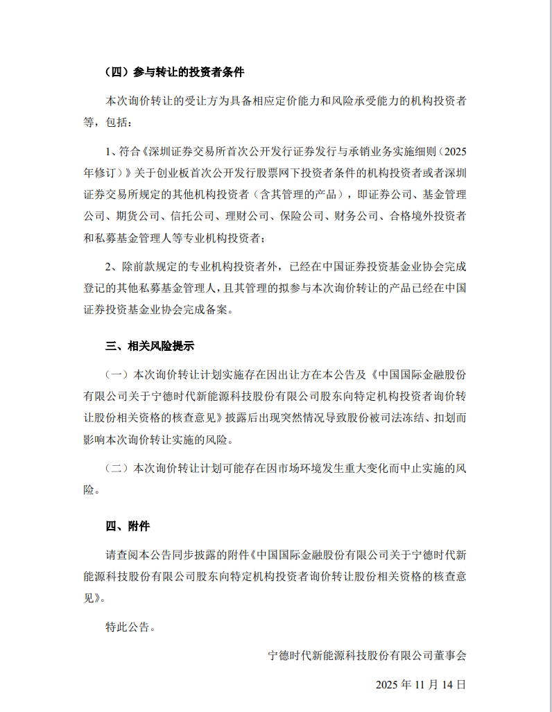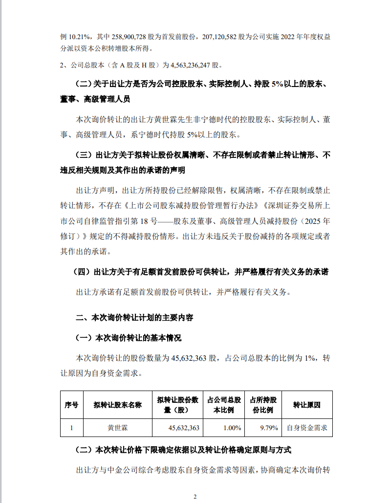 宁德时代:股东黄世霖拟询价转让4563.24万股股份 占总股本1%