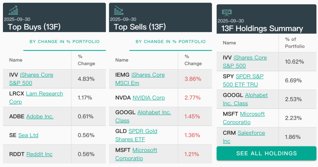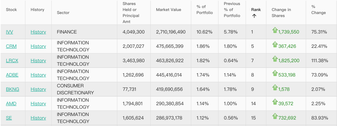 在对高价科技股表达谨慎态度的同时,桥水在第三季度大规模增持IVV(标普500ETF-iShares),增持数量约为174万份,与二季度末的持仓数量相比,增持比例高达75%。这表明在减持部分高位个股后,桥水选择将资金回归到代表美国整体经济的宽基指数上,作为一种防御性策略。