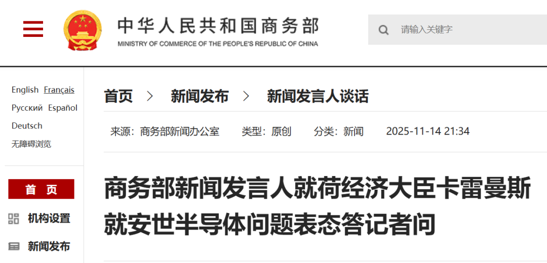 有记者问:荷兰经济大臣卡雷曼斯11月13日接受英国《卫报》采访,谈及安世半导体问题,称“即使事后来看,仍会作出同样的决定”、“这给各国领导人都是一个警示”。请问商务部对此有何评论?