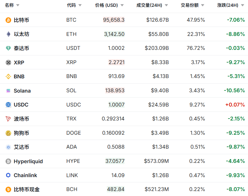 随着市场风险偏好的降温,11月14日盘中,加密货币市场大幅跳水,比特币跌破10万美元,以太坊、Solana一度跌超10%。截至22时20分,比特币跌7.06%报95658美元,以太坊跌8.86%报3142.50美元。另外,Solana跌超10%,XRP、艾达币、狗狗币跌超9%,BNB跌超5%。