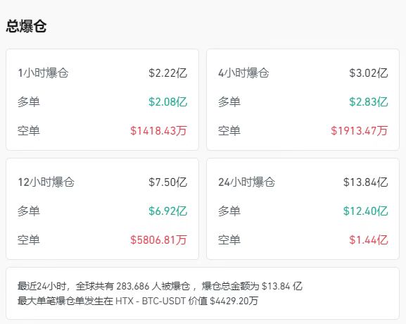 CoinGlass数据显示,24小时加密货币市场超28万人被爆仓,爆仓总金额为13.84亿美元,最大单笔爆仓发生在HTX-BTC-USDT,价值4429.2万美元。