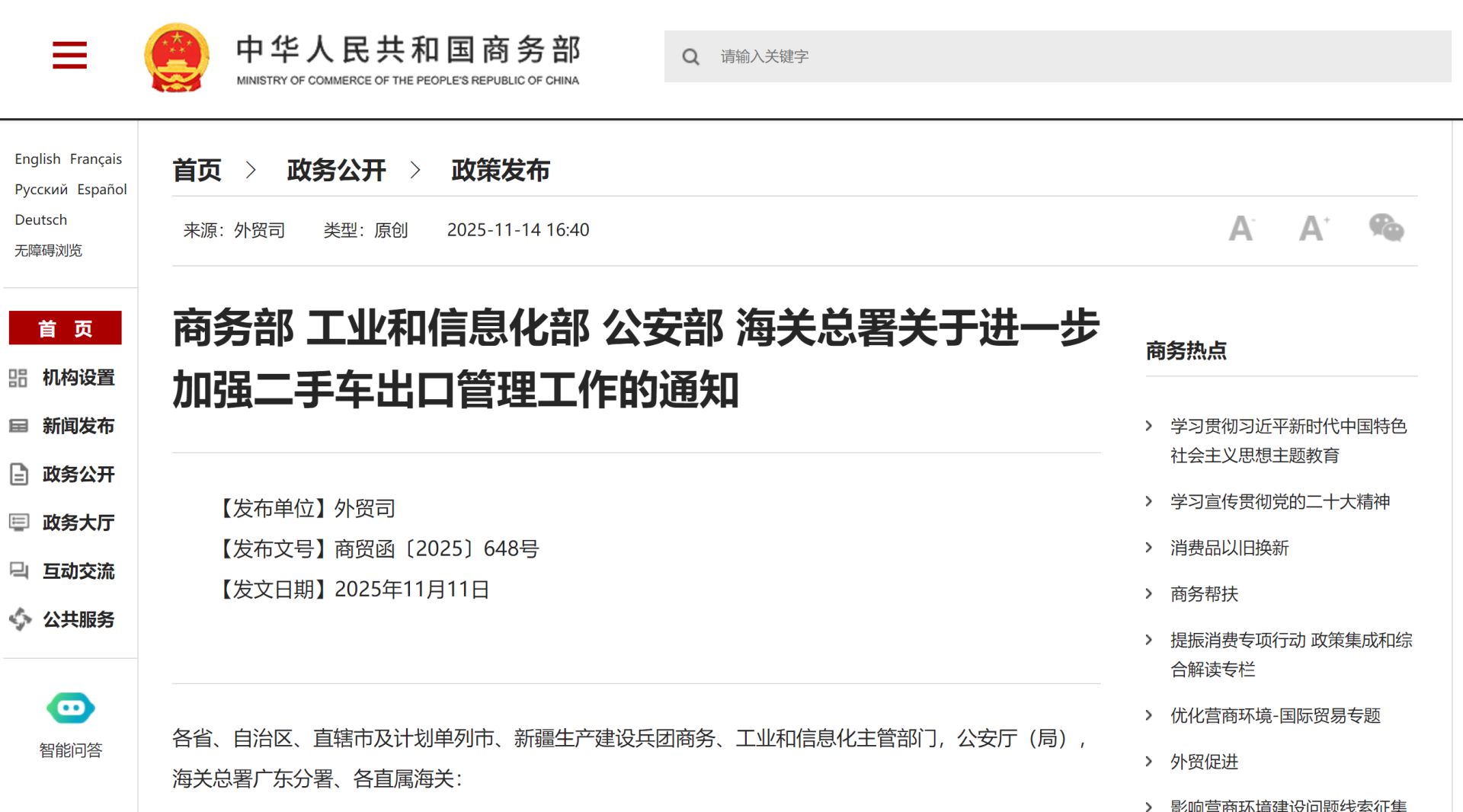 11月14日,据商务部网站消息,近日,商务部、工业和信息化部、公安部、海关总署发布关于进一步加强二手车出口管理工作的通知(以下简称《通知》)。