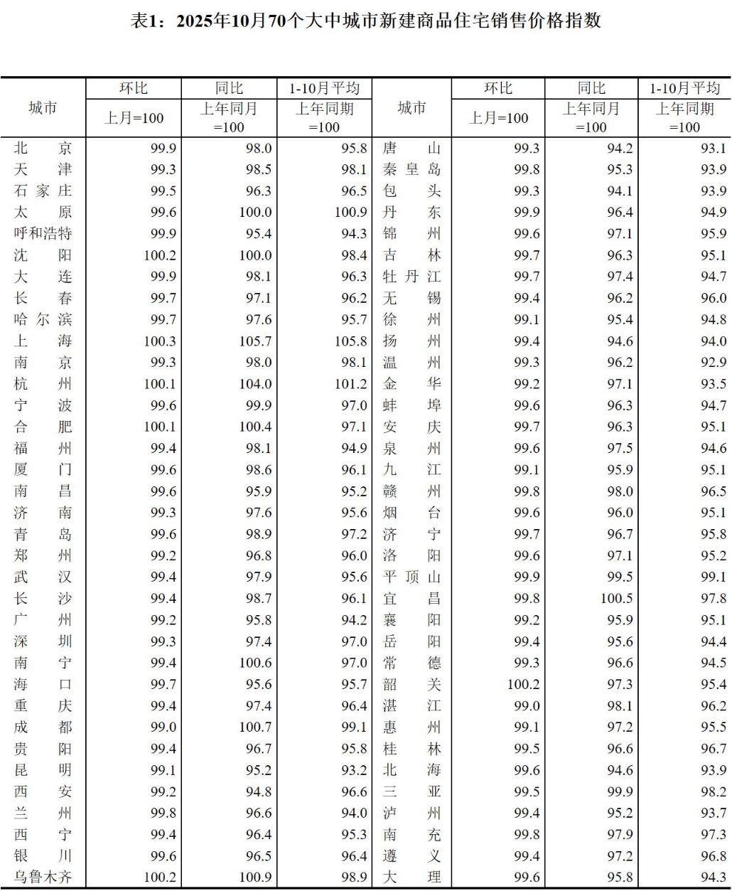 11月14日,国家统计局发布数据显示,2025年10月份,70个大中城市中,各线城市商品住宅销售价格环比和同比均下降。