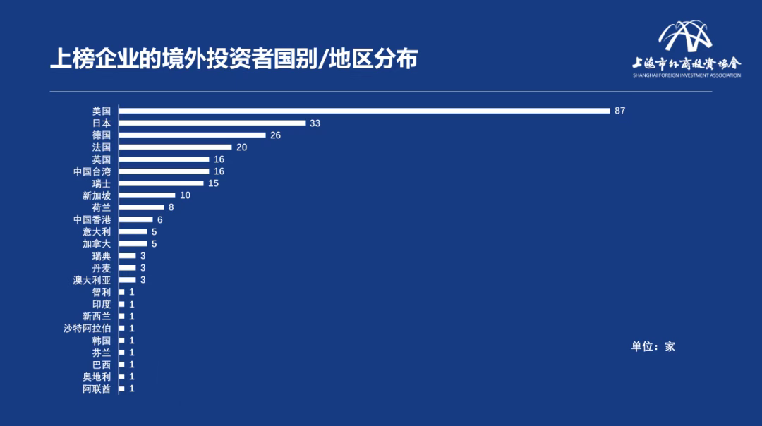 从境外投资者的国别/地区分布来看,美日德企业持续领跑,来自这三个国家的企业数量合计在榜单中占据半数以上,占比为55%。其中美国企业数量连续第五年位居榜首,共有87家企业上榜,较上一年度增加4家。