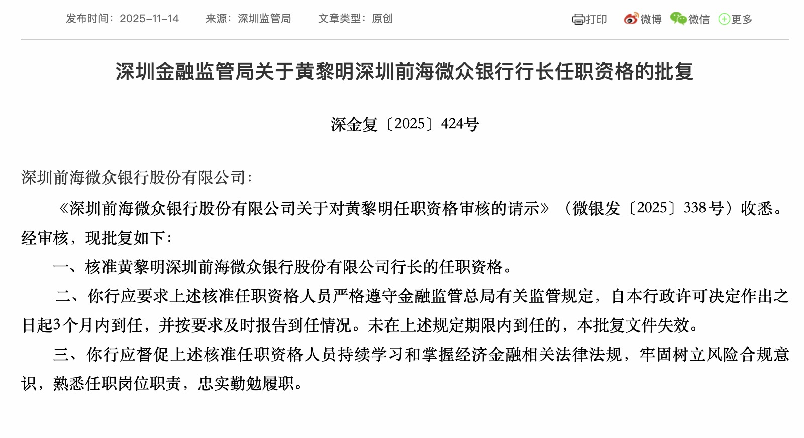 黄黎明获准担任微众银行行长