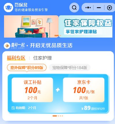 除了“权益产品+京东卡”,平台还有“权益产品+送积分”的购买形式。如价格94元的“住家护理权益”产品,包含最高100元的住家护理津贴和100积分,产品积分可以用于兑换其他权益产品或京东卡。