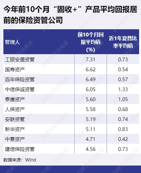 “固收+”产品前10个月平均回报靠后的保险资管公司有民生通惠、合众资产、太平资产等。