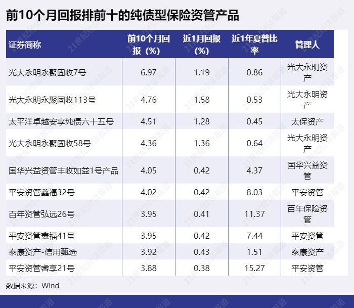 “光大永明永聚固收7号”依然在纯债型保险资管产品前10个月收益排名中排第一。