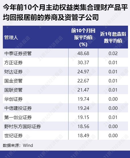 而10月此类产品平均回报为正收益的财达证券则实现排名跃升,从10名开外跃升至第三名。