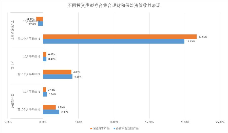 债市则在10月走出一波反弹行情,中债-新综合财富(总值)指数上涨0.64%。因此纯债型产品10月表现略有好转,纯债型券商集合理财产品、纯债型保险资管产品10月分别实现0.54%、0.43%的回报。