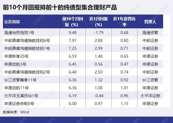 “海通怡然恒旭1号”虽然依然在纯债型集合理财产品前10个月收益排名中排第一,前10个月回报为9.48%,但10月回报为负。