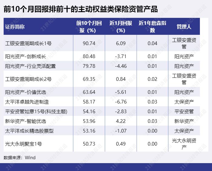 主动权益类保险资管产品中,“工银安盛周期成长1号”凭借10月排第一的净值涨幅,前10个月回报达90.74%同样排第一。
